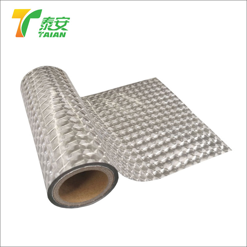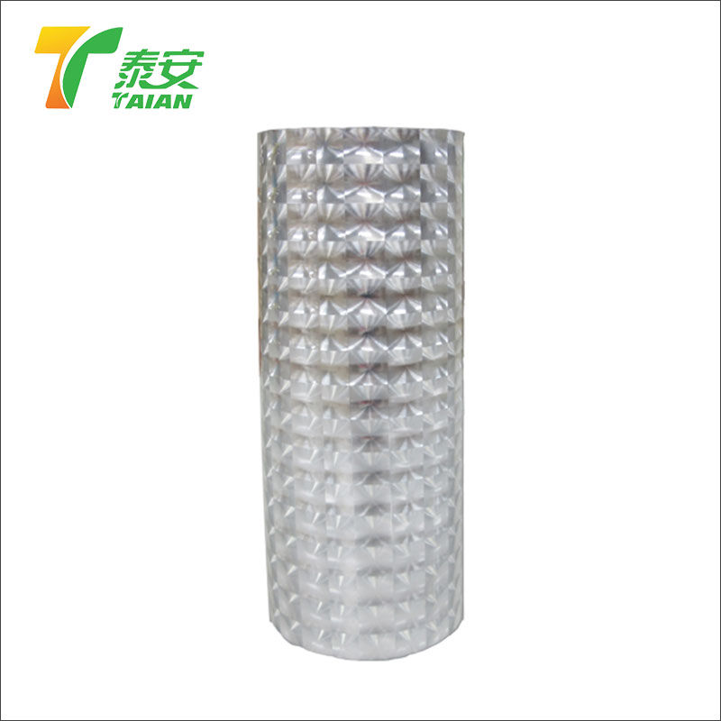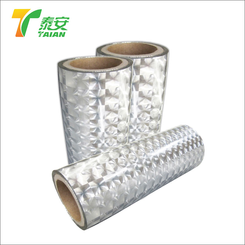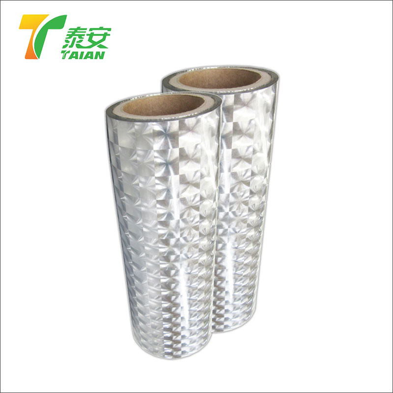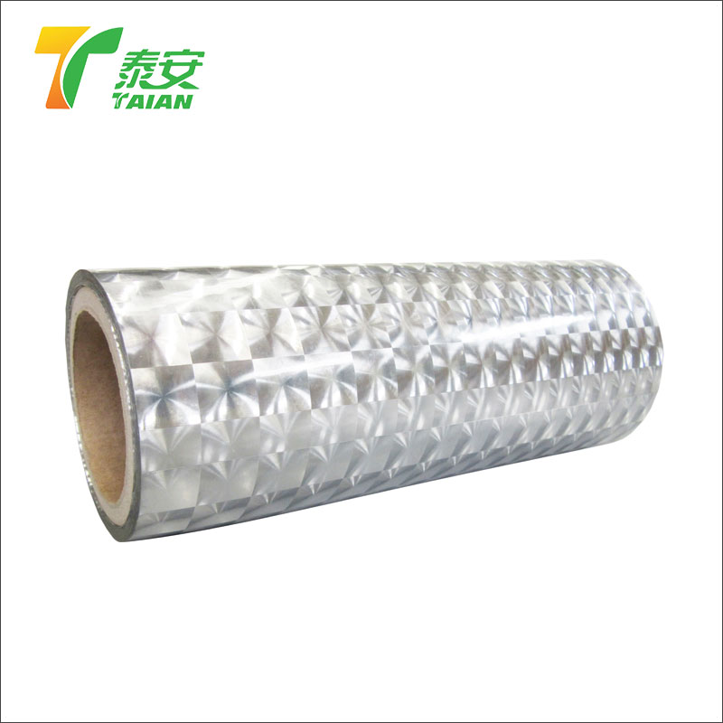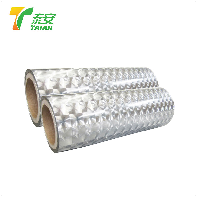 TAIAN 3D metalizuota terminio laminavimo plėvelė, sidabro spalvos. Medžiaga yra 3D pagrindu pagaminta plėvelė ir Eva karštieji klijai. Įprastas storis yra nuo 36 mikronų iki 85 mikronų, didžiausias plotis yra 1600 mm, paprastai naudojamas popierinis šerdis: 1'', 2'', 2,25 colių, 3 colių, 6 colių,